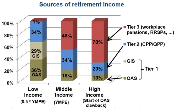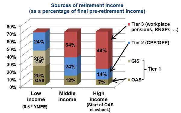 - For low income Canadians, a combination of Tier 1 and Tier 2 may sufficiently replace their employment income during retirement, if they contributed to Tier 2 schemes for a long period; otherwise they will have to add some Tier 3 savings.
