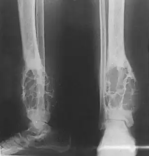 X-ray (side and front views) showing an adamantinoma in the large bone of lower leg, near the ankle. | |