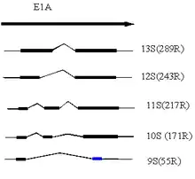 Almost an hour after viral infection, the virus undergoes transcription to form a primary gene E1A which undergoes alternative splicing, a regulated process where multiple protein isoforms are encoded by a primary gene via exons, parts of exons or introns being differentially joined or skipped. The E1A is spliced differentially into five transcripts with sedimentation coefficients of 13S, 12S, 11S, 10S and 9S,[10] all of which have been known to code for different proteins with varying numbers of amino acid residues of 289R, 243R, 217R, 171R, 55R, respectively, each performing different functions.[1] The 289R and 243R proteins are the major products encoded by the E1A of Ad5. These two proteins share almost the same internal sequences as shown in the figure except for the 46 internal amino acids unique to the 289 protein which is as a result of the differential splicing. These proteins are functionally important for growth of adenoviruses.[11]