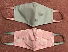A cloth face mask is worn over the mouth and nose and made of common textiles such as cotton. Masks vary widely in effectiveness, depending on factors such as material, fit and seal, and number of layers. They are usually less effective at filtering than surgical masks and offer much less protection.[16][17] Unlike disposable masks, there are no required standards for cloth masks.[18]