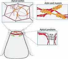In morphogenesis, apical constriction is the process in which contraction of the apical side of a cell causes the cell to take on a wedged shape. Generally, this shape change is coordinated across many cells of an epithelial layer, generating forces that can bend or fold the cell sheet.[1]