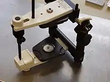 In 1840 the first US patent for dental articulators was issued to two Philadelphia, Pennsylvania, dentists: James Cameron and Daniley T. Evens.[1] One glaring weakness that became evident shortly after its release was its inability to manage mandibular movement. Through the 1850s and 60s dental scientists investigated the nature of mandibular movement. By the 1900s the single-hinge dental articulators became commonplace. It wasn't until 1910 that dentistry had its first articulator breakthrough due to the work of scientists like W. E. Walker, Alfred Gysi and George Snow. From their work two major schools of articulators developed. On one side there was the new condylar (anatomic) movement and on the other side there was the geometric (non anatomic) movement. The debate between anatomic and non anatomic is demonstrated in this article for an articulator that boasted a simple design.[2] Dr. Rudolph L. Hanau is credited with developing the Hanau articulator in the 1920s.