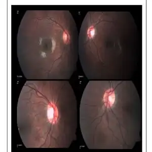 Blue cone monochromacy-Upper line has lower magnification,lower line has higher magnification (note lack of degenerative signs)