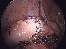 A hand-sewn bowel anastomosis, in this case of the sigmoid colon