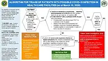 The Philippines reported its first suspected case of COVID-19 in January 2020. It involved a 5-year-old boy in Cebu, who arrived in the country on January 12 with his mother.[27] At that time, the Philippines had no capability to conduct COVID-19 tests.[28][29] The boy tested positive for "non-specific pancoronavirus assay" in the RITM. Samples from the boy were also sent to the Victorian Infectious Disease Reference Laboratory in Melbourne, Australia to determine the specific coronavirus strain.[27] The boy tested negative for COVID-19 but several suspected cases were already reported in various parts of the country.[30]
