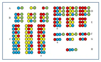 Positional scanning was introduced independently by Furka et al.[32] and Pinilla et al.[33] The method is based on the synthesis and testing of series of sublibraries. in which a certain sequence position is occupied by the same amino acid. The figure shows the nine sublibraries (B1-D3) of a full peptide trimer library (A) made from three amino acids. In sublibraries there is a position which is occupied by the same amino acid in all components. In the synthesis of a sublibrary the support is not divided and only one amino acid is coupled to the whole sample. As a result, one position is really occupied by the same amino acid in all components. For example, in the B2 sublibrary position 2 is occupied by the "yellow" amino acid in all the nine components. If in a screening test this sublibrary gives positive answer it means that position 2 in the active peptide is also occupied by the "yellow" amino acid. The amino acid sequence can be determined by testing all the nine (or sometime less) sublibraries.