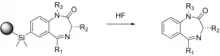 In most of the syntheses described here, it is necessary to attach and remove the starting reagent to/from a solid support. This can lead to the generation of a hydroxyl group, which can potentially affect the biological activity of a target compound. Ellman uses solid phase supports in a multi-step synthesis scheme to obtain 192 individual 1,4-benzodiazepine derivatives, which are well-known therapeutic agents.[28] To eliminate the possibility of potential hydroxyl group interference, a novel method using silyl-aryl chemistry is used to link the molecules to the solid support which cleaves from the support and leaves no trace of the linker.