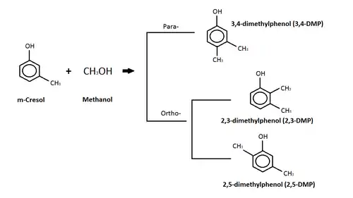 The diagram above depicts a reaction between m-cresol and methanol where a c-alkylation product is produced.[95] The c-alkylation reaction means that instead of replacing the hydrogen atom on the -OH group, the methyl group (from the methanol) replaces the hydrogen on a carbon in the benzene ring.[95] The products of this c-alkylation can be in either a para- or ortho- orientation on the molecule, as seen in the diagram, and water, which is not shown.[95] Isomers of the dimethylphenol (DMP) compound are the products of the para- and ortho-c-alkylation.[95] Dimethylphenol (DMP) compound is listed as an aquatic hazard by characteristic, and is toxic with long lasting effects.[97]