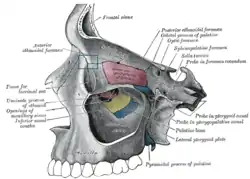 ![]() The skull from the front. (Dacryon visible but not labeled. Maxilla is yellow bone in center, frontal bone is light blue bone at top, and lacrimal bone is barely visible pink bone at center. Label for lacrimal bone is at center right.) | |