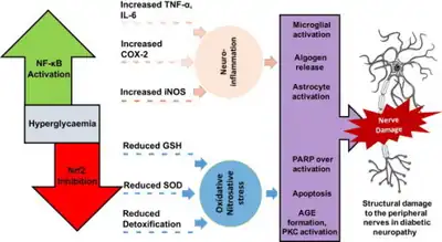 Role of NF-κB and Nrf2 in diabetic neuropathy. Hyperglycaemia induced imbalance in Nrf2–NF-κB regulation can contribute to the pathogenesis of diabetic neuropathy[9]