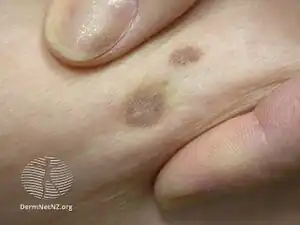 - ↑ Zaballos P, Llambrich A, Ara M, Olazarán Z, Malvehy J, Puig S (February 2006). "Dermoscopic findings of haemosiderotic and aneurysmal dermatofibroma: report of six patients". Br. J. Dermatol. 154 (2): 244–50. doi:10.1111/j.1365-2133.2005.06844.x. PMID 16433792. S2CID 22308659.
