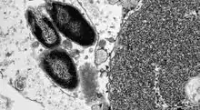 The internal structure of the bacteria was atypical. Electron-dense crystal-like structures were identified to be located in the center of almost all bacteria, usually surrounded by multilayer sheath-like structures. These layers alternate with electron-dense bands (6 nanometers) and light bands (15 nanometers). Up to seven electron-dense layers may be found in a single bacterium.