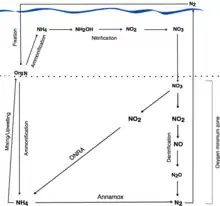 - 1 2 3 4 Lam, Phyllis and Kuypers, Marcel M. M. (2011). "Microbial Nitrogen Processes in Oxygen Minimum Zones". Annual Review of Marine Science. 3: 317–345. Bibcode:2011ARMS....3..317L. doi:10.1146/annurev-marine-120709-142814. hdl:21.11116/0000-0001-CA25-2. PMID 21329208.
