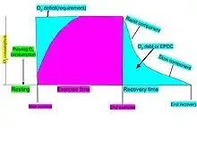 Excess post-exercise oxygen consumption (EPOC, informally called afterburn) is a measurably increased rate of oxygen intake following strenuous activity. In historical contexts the term "oxygen debt" was popularized to explain or perhaps attempt to quantify anaerobic energy expenditure, particularly as regards lactic acid/lactate metabolism;[1] in fact, the term "oxygen debt" is still widely used to this day. However, direct and indirect calorimeter experiments have definitively disproven any association of lactate metabolism as causal to an elevated oxygen uptake.[2]