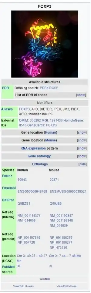 1. 1 2 3 Brunkow ME, Jeffery EW, Hjerrild KA, Paeper B, Clark LB, Yasayko SA, Wilkinson JE, Galas D, Ziegler SF, Ramsdell F (January 2001). "Disruption of a new forkhead/winged-helix protein, scurfin, results in the fatal lymphoproliferative disorder of the scurfy mouse". Nature Genetics. 27 (1): 68–73. doi:10.1038/83784. PMID 11138001. S2CID 13389419.