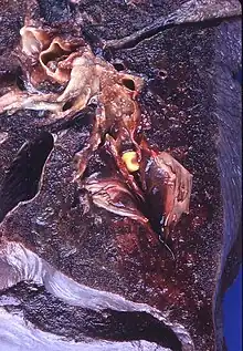Many complications can develop if a foreign body remains in the airway. There are also complications that may occur after removal of the object depending on the timeline of events.[2] Cardiac arrest and death are possible complications if a sudden complete obstruction occurs and immediate medical care is not performed.[7] The most common complication from a foreign body aspiration is a pulmonary infection, such as pneumonia or a lung abscess.[7] This can be more difficult to overcome in the elderly population and lead to even further complications. Patients may develop inflammation of the airway walls from a foreign body remaining in the airway.[2] Airway secretions can be retained behind the obstruction which creates an ideal environment for subsequent bacterial overgrowth.[7] Hyperinflation of the airway distal to the obstruction can also occur if the foreign body is not removed.[9] Episodes of recurrent pneumonia in the same lung field should prompt evaluation for a possible foreign body in the airway.[9]