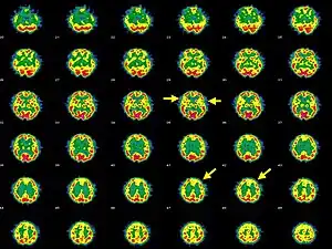 Brain SPECT transaxial images of a patient afflicted with Hashimoto's encephalopathy. | |
