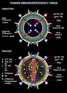 The final step of the viral cycle, assembly of new HIV-1 virions, begins at the plasma membrane of the host cell. The Env polyprotein (gp160) goes through the endoplasmic reticulum and is transported to the Golgi apparatus where it is cleaved by furin resulting in the two HIV envelope glycoproteins, gp41 and gp120.[87] These are transported to the plasma membrane of the host cell where gp41 anchors gp120 to the membrane of the infected cell. The Gag (p55) and Gag-Pol (p160) polyproteins also associate with the inner surface of the plasma membrane along with the HIV genomic RNA as the forming virion begins to bud from the host cell. The budded virion is still immature as the gag polyproteins still need to be cleaved into the actual matrix, capsid and nucleocapsid proteins. This cleavage is mediated by the packaged viral protease and can be inhibited by antiretroviral drugs of the protease inhibitor class. The various structural components then assemble to produce a mature HIV virion.[88] Only mature virions are then able to infect another cell.