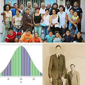 Examples of human phenotypic variability: people with different levels of skin colors, a normal distribution of IQ scores, the tallest recorded man in history - Robert Wadlow - with his father.