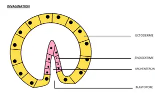 • Invagination is the morphogenetic processes by which an embryo takes form, and is the initial step of gastrulation,[4] the massive reorganization of the embryo from a simple spherical ball of cells, the blastula, into a multi-layered organism, with differentiated germ layers: endoderm, mesoderm, and ectoderm. More localized invaginations also occur later in embryonic development,