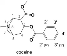 There are eight stereoisomers of cocaine (excluding mesomers and modifications to the internal portion of the tropane ring).[lower-alpha 4] Due to the presence of four asymmetric carbon atoms in the 1- & 5- to 8 (N) position bond bridge that could adopt R- & S- configurations, cocaine can be considered to have as many as sixteen stereoisomers. However, geometric constraints imparted by the bridgehead amine allow only eight to be created.