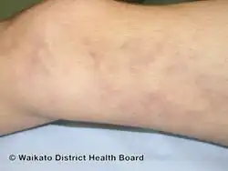Livedo reticularis is a skin finding consisting of a mottled reticulated vascular pattern that appears as a lace-like purplish discoloration of the skin.[1][2] The discoloration is caused by reduction in blood flow through the arterioles that supply the cutaneous capillaries, resulting in deoxygenated blood showing as blue discoloration. This can be a secondary effect of a condition that increases a person's risk of forming blood clots, including a wide array of pathological and nonpathological conditions. Examples include hyperlipidemia, microvascular hematological or anemia states, nutritional deficiencies, hyper- and autoimmune diseases, and drugs/toxins.