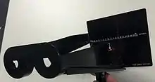 The Maddox Wing is an instrument utilized by ophthalmologists, orthoptists and optometrists in the measurement of strabismus (misalignment of the eyes; commonly referred to as a squint or lazy eye by the lay person). It is a quantitative and subjective method of measuring the size of a strabismic deviation by dissociation of the eyes brought about by two septa which are placed in such a way as to present fields to either eye separated by a diaphragm at the centre.[1] The right eye sees a red and white arrow, each of which point to a scale with numbers seen by the left eye; the red arrow points to the vertical red scale and the white arrow points to the horizontal white scale. A third arrow located to the right and below the horizontal white scale is used to measure torsion