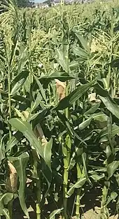 If corn plants are infected with MDMV, ear formation and development are slowed leading to grain yield loss.[4] The damage from MDMV can cause the halting of ear formation and development, ultimately leading to the production of barren ears and direct yield loss.[5] There can be losses of up to 42% on early-planted field corn.[6] If corn is planted late MDMV can cause 75% or more loss on inbred and hybrid varieties.[6][7] The number of ears per plant is reduced by MDMV infection and the fresh weight of these ears can be reduced by 30%.[8]