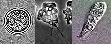 Trophozoites change to cyst form to survive times when the environment is temporarily harsh.[14] The cyst is a spherical, single-layered, smooth wall about 7–15 µm in diameter, that encloses a single nucleus.[15]