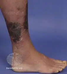 Necrotizing fasciitis (NF), also known as flesh-eating disease, is an infection that results in the death of parts of the body's soft tissue.[3] It is a severe disease of sudden onset that spreads rapidly.[3] Symptoms usually include red or purple skin in the affected area, severe pain, fever, and vomiting.[3] The most commonly affected areas are the limbs and perineum.[2]