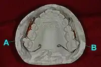 Occlusal view of an interim palatal lift prosthesis master cast with orthodontic wire clasps bent to engage composite resin (A) affixed to tooth number 2 and an orthodontic bracket (B) affixed to tooth number 15