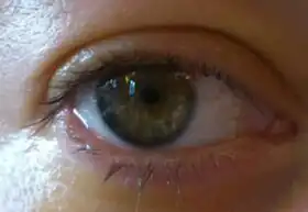 ![]() Photo of an eye after PIOL-implantation, 24 hours after surgery. The lens is visible in front of the iris; the pupil is still small due to presurgery eyedrops. |