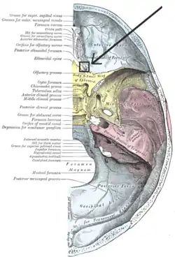 ![]() Base of the skull. Upper surface. (On the left, "Posterior ethmoidal foramen" is the 9thlabel from the right. | |