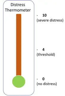 The Distress Thermometer (DT) is an established self-assessment tool that invites patients to score their perceived level of distress during the previous week on a scale from 0 (no distress) to 10 (severe, intolerable distress).[11] 39 different prompts classified as "Practical", "Family", "Emotional", "Spiritual", and "Physical" categories are utilized to evaluate the wellbeing of patients experiencing psychosocial distress. An average rating of >=4 points is regarded as significant, necessitating additional medical evaluation to determine the best course of medical care.