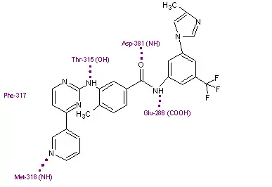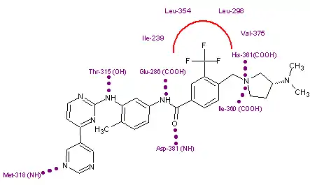 Nilotinib binds to the inactive conformation of the Abl kinase domain, largely through lipophilic interactions and thus blocks its catalytic activity.[11][17] Nilotinib binds to the kinase domain by making four hydrogen bond interactions involving the pyridyl-N and the backbone NH of Met-318, the anilino-NH and the side chain OH of Thr-315, the amido-NH and side chain carboxylate of Glu-286 and the amido carbonyl with the backbone NH of the Asp-381.[12][20] The [4-(3-pyridinyl)-2-pyrimidinyl] anilino segment of nilotinib has close binding interactions with Met-318, Phe-317 and Thr-315 residues of a region within the ATP binding site. The remaining half of the compound extends beyond the Thr-315 gatekeeper residue to bind within an additional pocket. The 3-methylimidazole and trifluoro-methyl groups of nilotinib make important interactions with the Abl kinase domain. These groups also make the shape of nilotinib very different from that of imatinib. Nilotinib also binds to the kinase through a large number of weak van der Waals interactions.[12]
