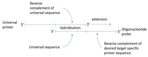 The oligonucleotide probe may also be blocked at the 3’ end preventing equivalent extension of the probe, but this is not essential. The probe is not consumed; it is available to act as a template for the universal primer to be ‘converted’ into target specific primer throughout successive PCR cycles. This generation of target specific primer occurs in parallel with standard PCR amplification under standard PCR conditions.
