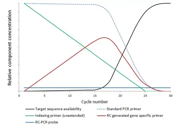 In RC-PCR, no target specific primers are present in the reaction mixture. Instead target specific primers are formed as the reaction proceeds. A typical reaction employing the approach requires four oligonucleotides. The oligonucleotides interact with each other in pairs; one oligonucleotide probe and one universal primer (containing functional domains of choice), which hybridize with each other at their 3’ ends. Once hybridized, the universal primer can be extended, using the oligonucleotide probe as the template, to yield fully formed, target specific primers, which are then available to amplify the template in subsequent rounds of thermal cycling as per a standard PCR reaction.