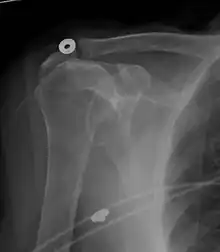 Normally, the former is positioned inferiorly to the latter, and a reversal is therefore indicating a rotator cuff tear.[47] Prolonged contact between a high-riding humeral head and the acromion above it, may lead to X-rays findings of wear on the humeral head and acromion and secondary degenerative arthritis of the glenohumeral joint (the ball and socket joint of the shoulder), called cuff arthropathy, may follow.[46] Incidental X-ray findings of bone spurs at the adjacent acromioclavicular joint may show a bone spur growing from the outer edge of the clavicle downwards towards the rotator cuff. Spurs may also be seen on the underside of the acromion, once thought to cause direct fraying of the rotator cuff from contact friction, a concept currently regarded as controversial.
