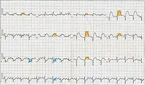 12-lead electrocardiogram showing ST-segment elevation (orange) in I, aVL and V1–V5 with reciprocal changes (blue) in the inferior leads, indicative of an anterior wall myocardial infarction.