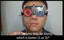 • The patient is shown the lens in both flip positions. Both options may be blurry, the patient is asked to indicate which is clearer of the two.[6]
