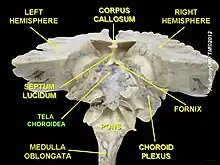 In the lateral ventricles, the tela choroidea–a double-layered fold of pia mater and ependyma, produces the choroid fissure (sometimes also called the choroidal fissure but this is different from the choroidal fissure of the optic stalk). The choroid fissure is C-shaped, runs between the fornix and the thalamus in the body of the ventricle, and between the stria terminalis and hippocampal fimbria in the inferior horn, and is the location of the attachment of the margins of the choroid plexus.[5][6] In the choroid fissure of the lateral ventricles, the tela choroidea is a lateral extension of the tela choroidea from the third ventricle.[7]