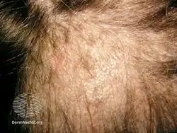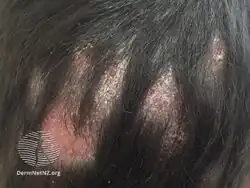 Tinea capitis, also known as ringworm of the scalp, is a type of fungal infection of the skin of the scalp.[2][3] The clinical presentation is typically single or multiple patches of hair loss, sometimes with a 'black dot' pattern (often with broken-off hairs), that may be accompanied by inflammation, scaling, pustules, and itching.