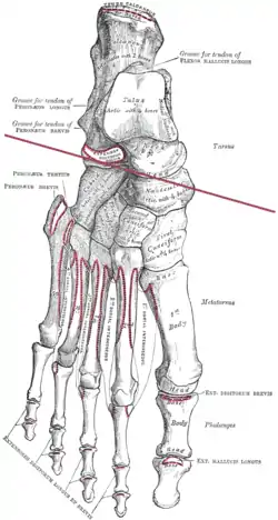 The transverse tarsal joint or midtarsal joint or Chopart's joint is formed by the articulation of the calcaneus with the cuboid (the calcaneocuboid joint), and the articulation of the talus with the navicular (the talocalcaneonavicular joint).