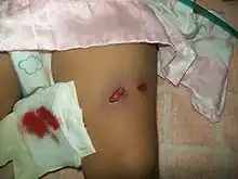 A gunshot wound to the left thigh showing entry and exit wound of a 3 year old girl. | |