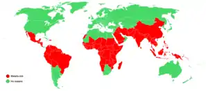 In developing countries alone, 22 million people are living with HIV. Most infections are still in Africa, but Europe, Asia, Latin America, and the Caribbean are now seeing large numbers of infections as well.[6][7] 95% of expected new infections will occur in the low-income countries in the tropics.[8][7] The expected number of new infections is 3-4 million per year.[7] Risk factors such as needle use and unprotected sex are much more prevalent in tropical and underdeveloped areas. Once HIV is transmitted to a tropical area it is spread throughout the sexually active population. Though how fast and how far it spreads varies, some African countries have an HIV prevalence of 10%. More alarming still, in urban areas, prevalence among pregnant women can get as high as 30%. Healthcare professionals themselves are at great risk of exposure to HIV. An HIV prevalence of 10% means any given workforce will also have a 10% prevalence, and this does not exclude the healthcare team.[7] Tuberculosis is thought to cause a more rapid disease progression. Tuberculosis is prevalent in tropical and under-developed countries, only making HIV more devastating.[9] Without the expensive and high-tech medical equipment of developed, western countries, physicians in the tropics are left with few options. If they are able to catch an HIV-related bacterial or mycobacterial disease they can diagnose and manage the disease with basic drugs and standard treatment protocol. Many under-developed countries do not have a care strategy, and of those that do, they aren't as effective as they need to be to stop the spread of HIV.[7]