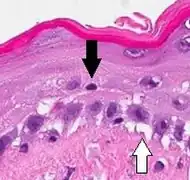 • Vacuolization within the basal keratinocytes (white arrow in image)