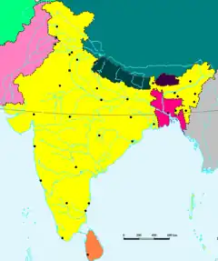 Water resources in India includes information on precipitation, surface and groundwater storage and hydropower potential. India experiences an average precipitation of 1,170 millimetres (46 in) per year, or about 4,000 cubic kilometres (960 cu mi) of rains annually or about 1,720 cubic metres (61,000 cu ft) of fresh water per person every year.[1] India accounts for 18% of the world's population and about 4% of the world's water resources. One of the proposed solutions to solve the country's water woes is the Indian rivers interlinking project.[2] Some 80 percent of its area experiences rains of 750 millimetres (30 in) or more a year. However, this rain is not uniform in time or geography. Most of the rains occur during its monsoon seasons (June to September), with the northeast and north receiving far more rain than India's west and south. Other than rains, the melting of snow over the Himalayas after the winter season feeds the northern rivers to varying degrees. The southern rivers, however, experience more flow variability over the year. For the Himalayan basin, this leads to flooding in some months and water scarcity in others. Despite an extensive river system, safe clean drinking water as well as irrigation water supplies for sustainable agriculture are in shortage across India, in part because it has, as yet, harnessed a small fraction of its available and recoverable surface water resource. India harnessed 761 cubic kilometres (183 cu mi) (20 percent) of its water resources in 2010, part of which came from unsustainable use of groundwater.[3][4] Of the water it withdrew from its rivers and groundwater wells, India dedicated about 688 cubic kilometres (165 cu mi) to irrigation, 56 cubic kilometres (13 cu mi) to municipal and drinking water applications and 17 cubic kilometres (4.1 cu mi) to industry.[1]