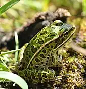 Amphibians such as frogs and salamanders need both terrestrial and aquatic habitats in which to reproduce and feed. Because amphibians often inhabit depressional wetlands like prairie potholes and Carolina bays, the connectivity among these isolated wetlands is an important control of regional populations.[52] While tadpoles feed on algae, adult frogs forage on insects. Frogs are sometimes used as an indicator of ecosystem health because their thin skin permits absorption of nutrients and toxins from the surrounding environment resulting in increased extinction rates in unfavorable and polluted environmental conditions.[53]