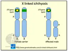 X-linked ichthyosis (abbreviated XLI) is a skin condition caused by the hereditary deficiency of the steroid sulfatase (STS) enzyme that affects 1 in 2000 to 1 in 6000 males.[2] XLI manifests with dry, scaly skin[3] and is due to deletions[4][5] or mutations[6] in the STS gene. XLI can also occur in the context of larger deletions causing contiguous gene syndromes.[4] Treatment is largely aimed at alleviating the skin symptoms.[7] The term is from the Ancient Greek 'ichthys' meaning 'fish'.