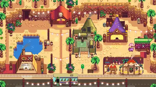 The Desert Festival takes place in the Desert during Spring 15-17, from 10am to 2am. The player does not need to wait for Pam to arrive at the Bus Stop to visit the Desert for the first two days of the festival. There are various rotating stock shops, a race to bet on, challenges to complete for event currency, and a daily opportunity to receive a new outfit from Emily.